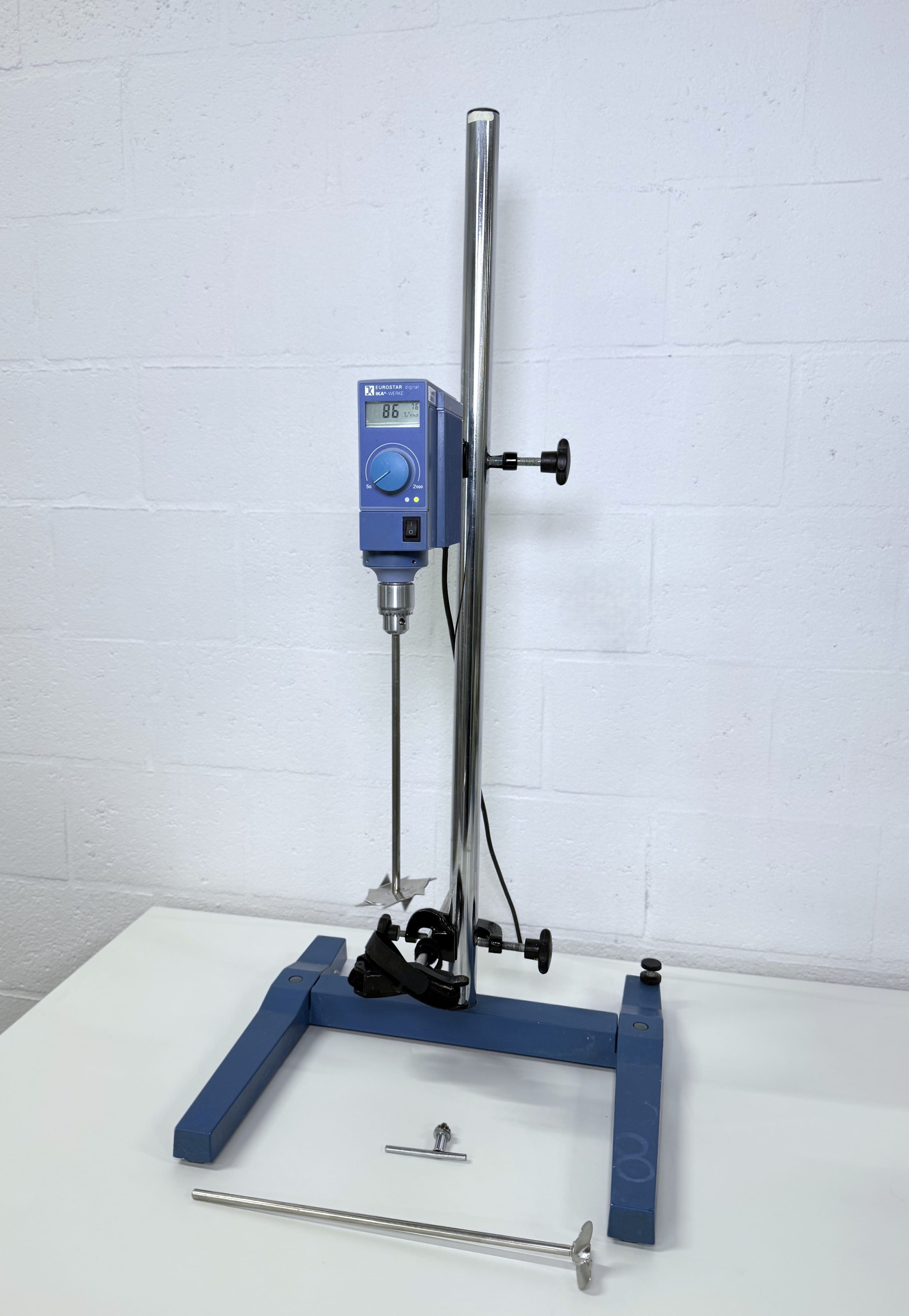 Reliable IKA EURO ST-D overhead stirrer offered complete with 2 stirring paddles and H-stand.